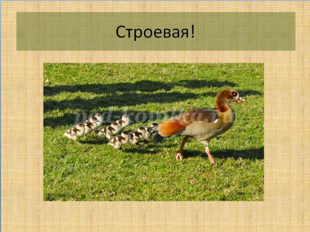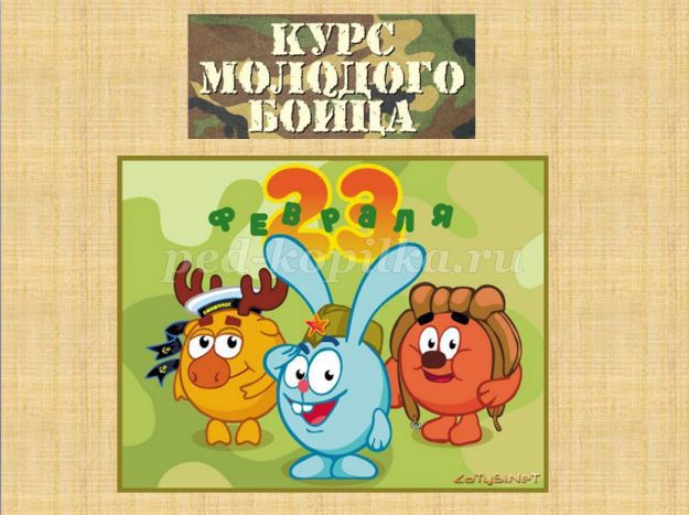 Учасники двох команд шикуються в ряд один за одним. Під пісню ВІА "Полум'я" "Йде солдат по місту" починають марширувати вздовж кабінету. Перемагає та команда, яка чітко і правильно пройде буд. Переможці отримують солодкі призи: чупа чупси.