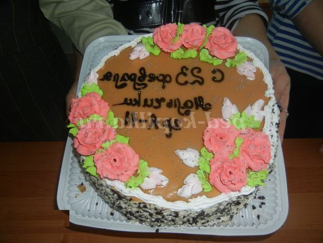 Під пісню Леоніда Агутіна «Межа» дівчинки заносять найголовніший приз для хлопців - це торт з написом «З 23 лютого! Хлопчики гр. а-11»