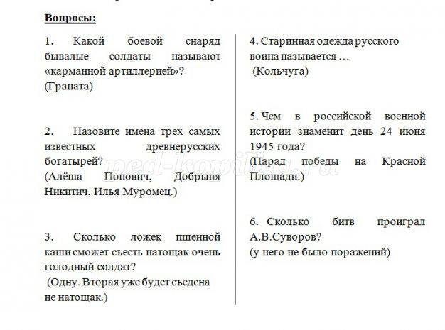 Ведучий: Прослухайте правило змагання. По команді, по черзі кожен учасник повинен на певній відстані стрельнути в кульку дротиком. Потрапивши в нього, розгорнути листочок з питанням, прочитати вголос і відгадати. Якщо відповіді не буде, то дозволяється відповісти вболівальникам нашої зустрічі. Якщо кулька не лопнула, то черга переходить іншій команді. Перемагає та команда, яка дасть більше правильних відповідей.