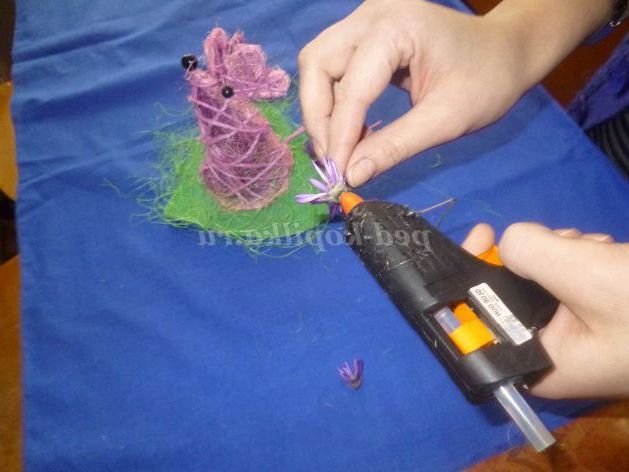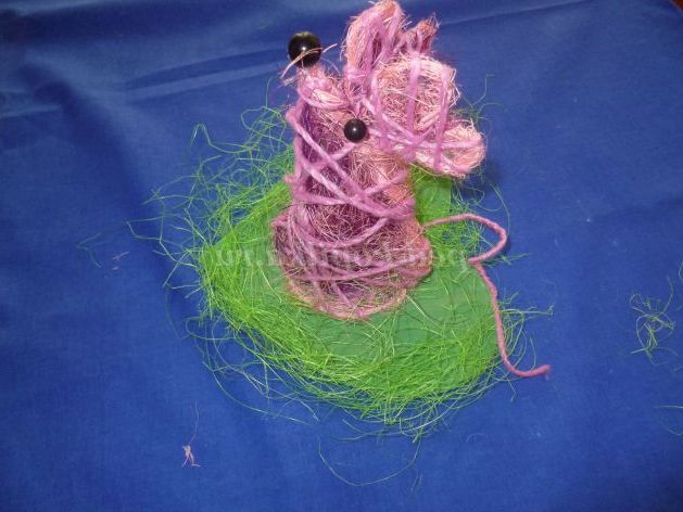 Приклеюємо вуха, бус - очі і ніс. Хвостик робимо з дроту, обклеївши її флористичної папером або пряжею.
