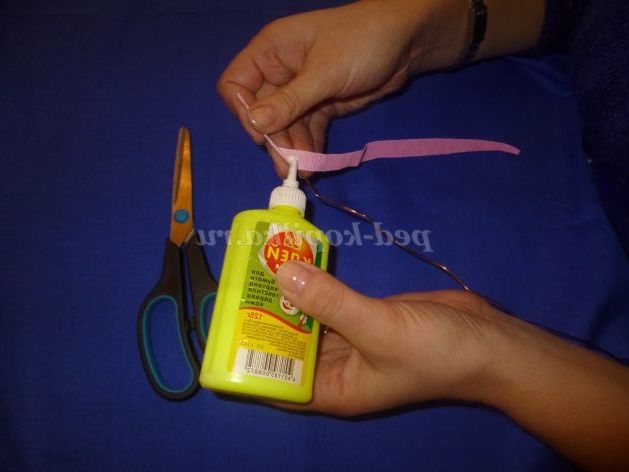 Мишка-валентинка складається з «сердечок»: тулуб і два вуха. Для виготовлення тулуба беремо мідну дріт довжиною приблизно 50 см, для вух - 16 див. Обмотуємо її смужкою гофрованого паперу, змащуючи клеєм ПВА.
