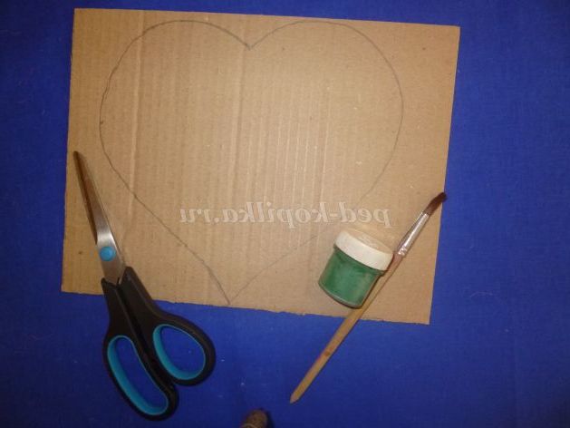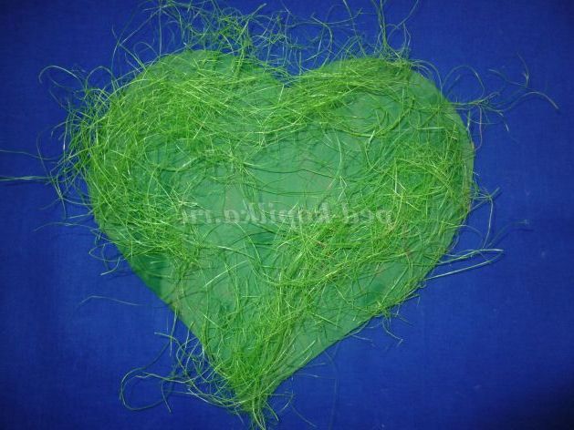 Приступаємо до виготовлення підставки - галявини для нашої мишки. З картону вирізаємо сердечко і наносимо його в зелений колір. На нього викладаємо трохи сизалю зеленого кольору.