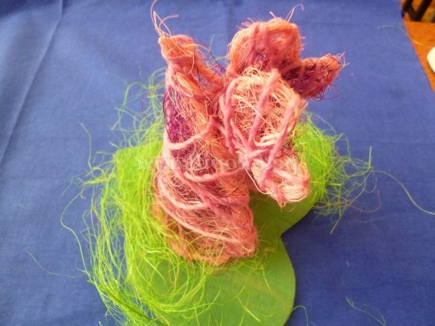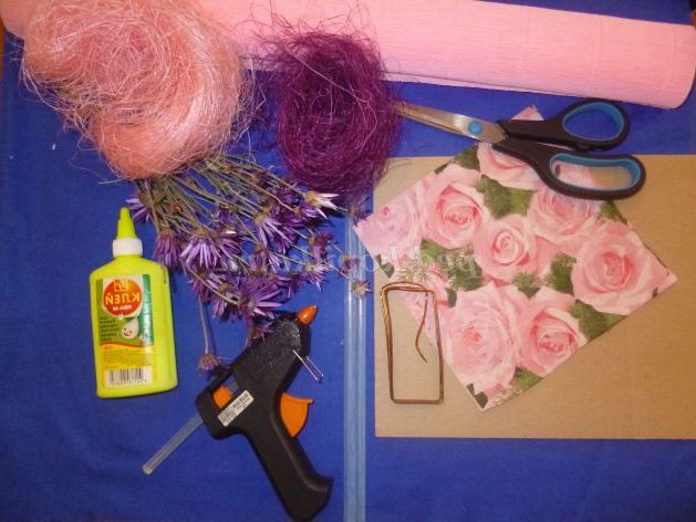 Матеріали та інструменти: сизаль, дріт, гофрований папір, пряжа, клей ПВА, термопістолет, ножиці, картон, гуаш, пензель, ксерантемум (сухоцвіти).