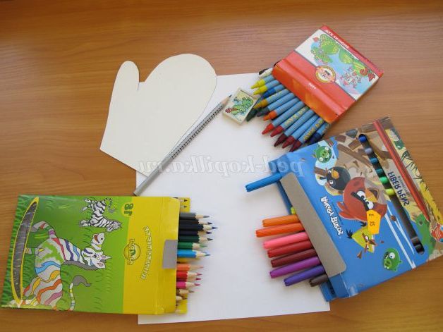 Матеріали: Простий олівець, воскові крейди, кольорові олівці, фломастери, гумка, картонна рукавиця, аркуш паперу формату А4.