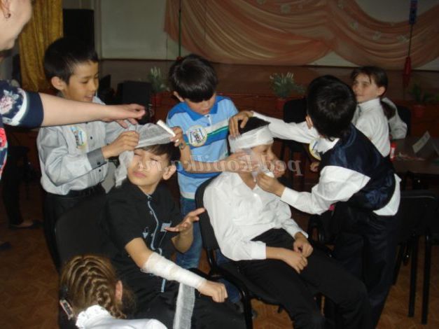 (Учасникам команди потрібно накласти пов'язку на голову і руку пораненого)