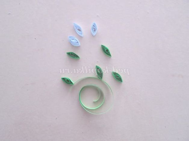Для завершення композиції виготовимо квіти підсніжника. Для цього використовуємо білі і зелені роли. Замість білих можна використовувати і жовті, тоді квітка буде жовтим.