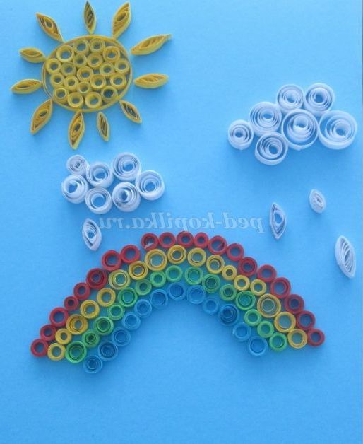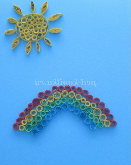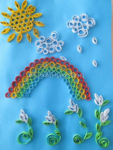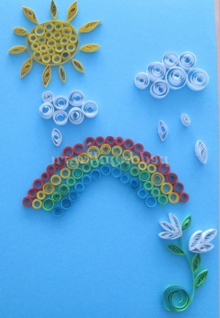 Я пропоную виготовити картину із зображенням весняного дня в техніці квіллінг. На ній зобразимо веселку і проліски - що є ознакою відродження природи, наближення літа, благодатного союзу землі і неба.