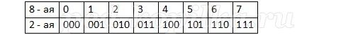Це буде двійкова послідовність 0001 0101 1101. Потім, відкидаючи три крайніх лівих нуля (вони незначні) і розбиваючи двійкове число 101011101 на трійки 101 011 101, замінимо кожну трійку з допомогою таблиці 1 однією вісімковій цифрою, отримаємо вісімкове число 535. З двох вісімкових чисел 535 і 525 найменше число - 525. Таким чином, в якості відповіді задачі виберемо другий варіант відповіді.