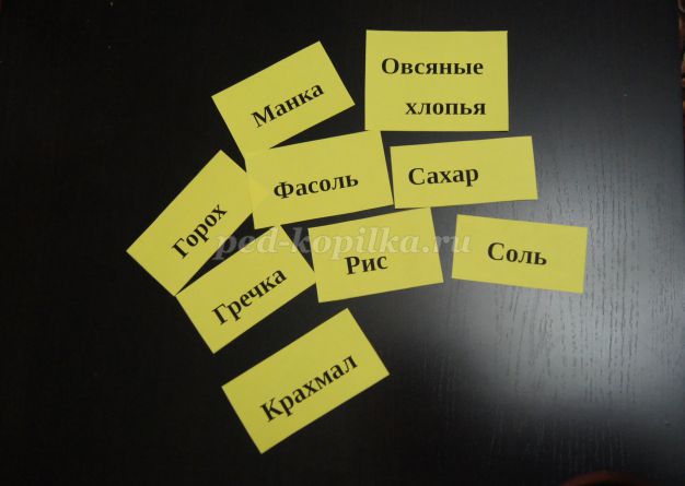 Назва продуктів можна надрукувати великим шрифтом на аркуші кольоровому папері за допомогою принтера. Цей лист розрізаємо на окремі картки.