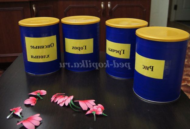 Тепер беремо картки з назвами продуктів і з допомогою скотча приклеюємо до кожної банку.