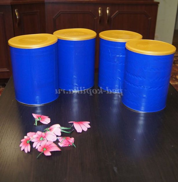 Отже, вам знадобиться: бляшані банки,синя самоклеюча плівка і плівка з квітами, картки з назвами продуктів, ножиці, скотч, лінійка, олівець.