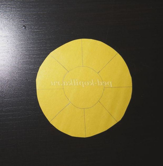 6. Два маленьких кола - це серединка. Прикладаємо її у центр великих кіл і обводимо. Далі з допомогою олівця і лінійки ділимо коло на вісім секторів кожен.