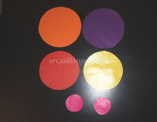 5. Далі робимо квіти. З допомогою циркуля малюємо кола на кольорового паперу різного кольору. Нам потрібно два кола діаметром 10 см, два кола діаметром 9 см і два кола діаметром 4 див.