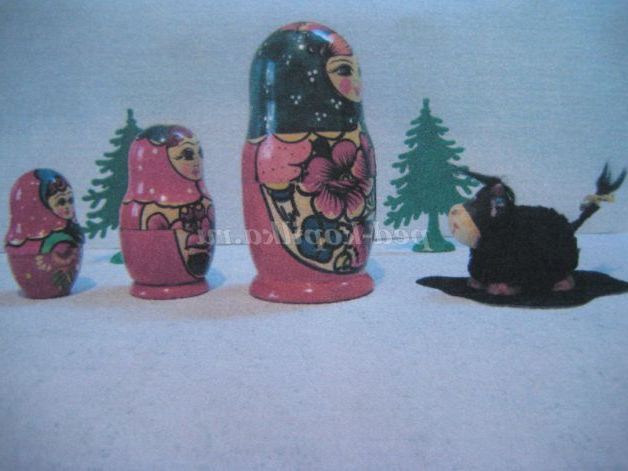 Логопед ставить матрьошок в ряд по лінії, а діти розкладають біля кожної з них предмети: великого розміру - біля Настасії, середнього - близько Насті, маленького - близько Настусі. Таким чином, вони визначають, хто які подарунки приніс для бичка.