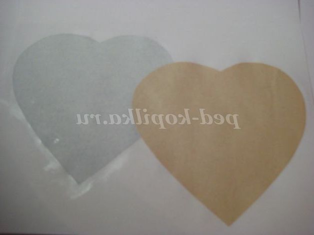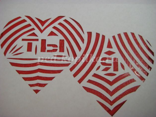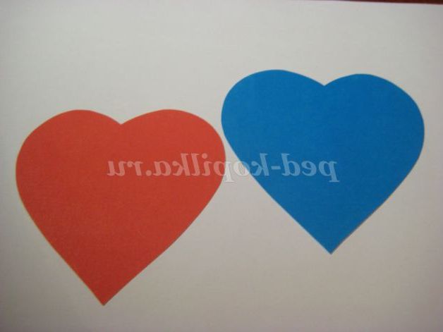 Вирізаємо з кольорового паперу два серця. Розмір їх повинен бути на 0,5 см більше вирізаних на листку-заготівлі сердець.