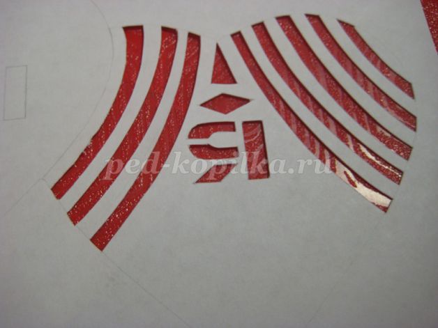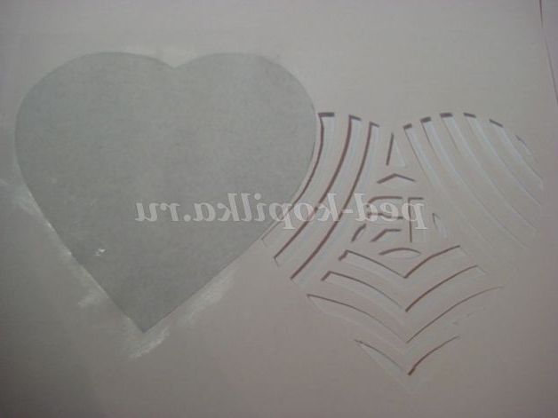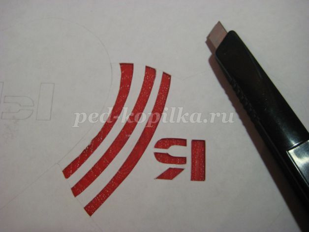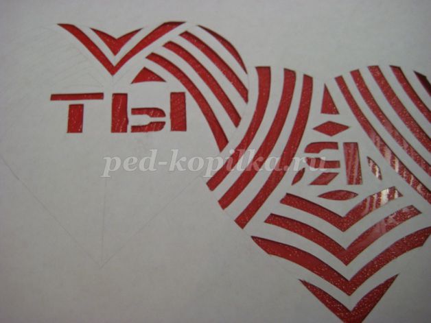 Під лист з серцями (назвемо його заготівлею) підкладаємо дощечку, щоб не зіпсувати стіл. І з допомогою макетного ножа робимо прорізи в серці /лінії можна попередньо намалювати/ і вирізаємо по контуру літери