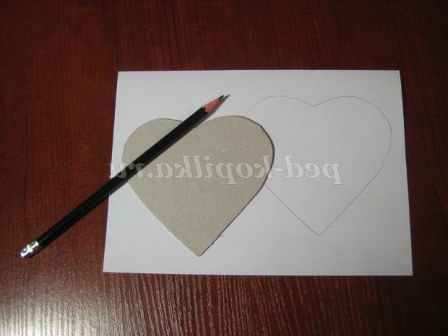 Складаємо альбомний аркуш навпіл і розрізаємо його на дві частини. На одній частині з допомогою трафарету, який можна виготовити з картону, малюємо два серця. Не натискаємо на олівець, щоб лінії були ледь помітні. /Для фото - лінії виражені/