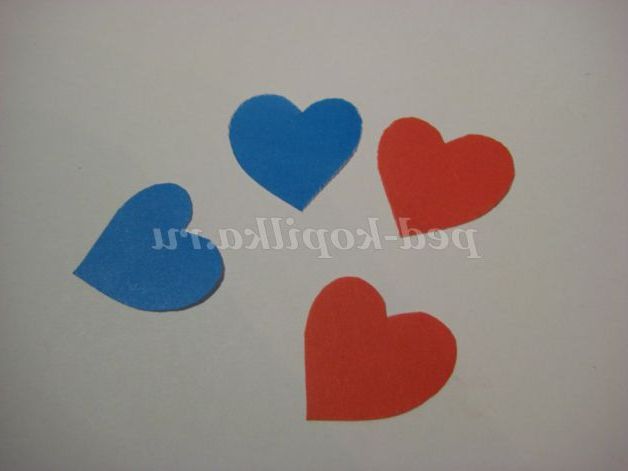 З кольорового паперу вирізаємо чотири маленькі сердечка