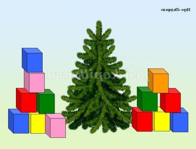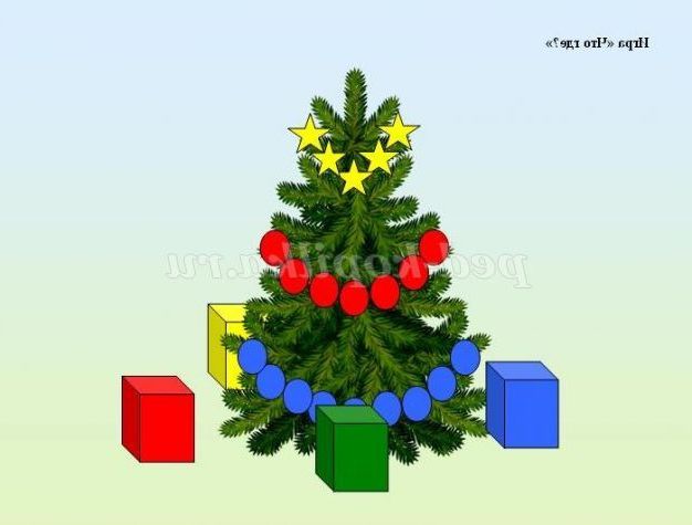 Завдання: Дорослий пропонує дитині розглянути і відповісти на питання лежать подарунки (коробки) по відношенню до ялинки: