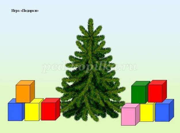 - подарунки якого кольору лежать з правого боку від ялинки,