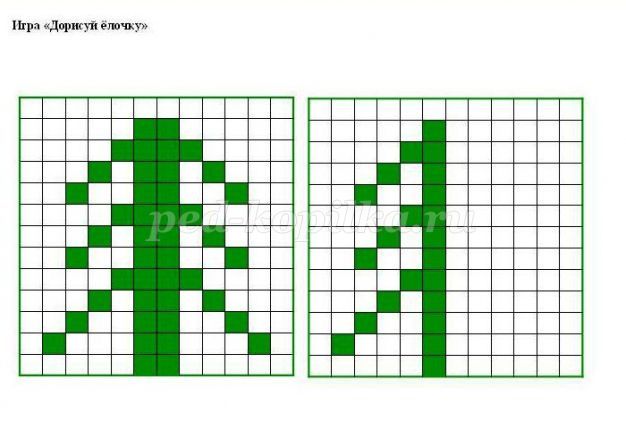 Завдання: Дорослий пропонує дитині розглянути малюнок (геометричне зображення ялинки) і викласти, орієнтуючись на зразок другу половину зображення ялинки геометричними фігурами (квадратами).