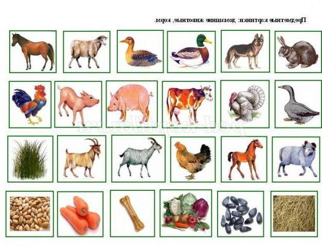 Предметні картинки з зображенням домашніх тварин і корми: корова, кінь, лоша, корова, коза, козел, вівця, баран, свиня, порося, кролик, селезень, качка, гуска, індик, півень, курка кістка, овочі, морква, трава, сіно, зерно.