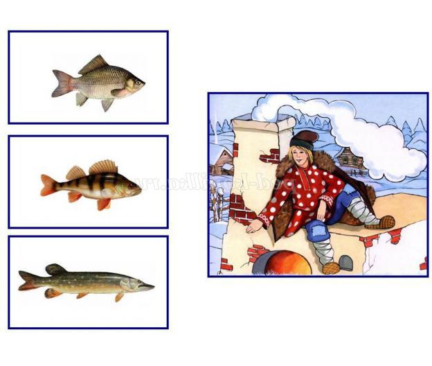 Вихователь: Яку рибу зловив Омелько в ополонці? Назвіть і покажіть її на картинці.