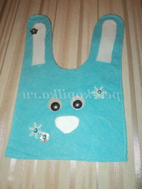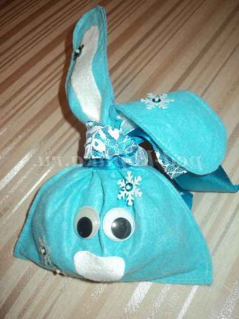 Лист флісу або фетру розміром близько 40 см Х 50 см блакитного кольору (залежно від бажаного розміру), невеликий шматочок фетру білого кольору (для деталей), рухомі очі, ручка, ножиці, голка, нитки, паєтки, красива тасьма близько 30 см, а так само наповнення нашого подарункового мішечка - цукерки або інший сюрприз. Якщо є швейна машинка - можна скористатися нею, якщо немає - можна прошити вручну.