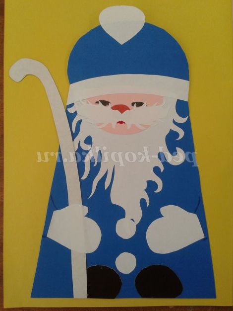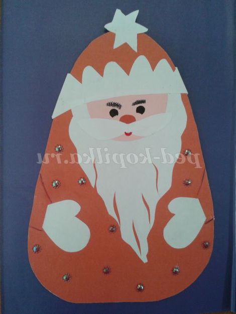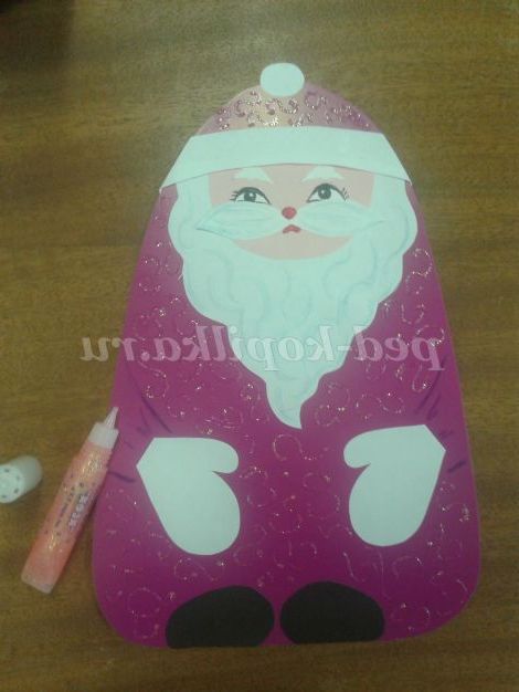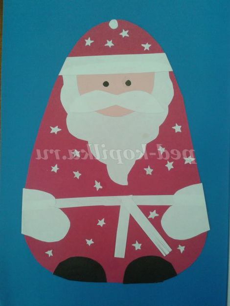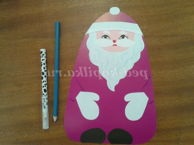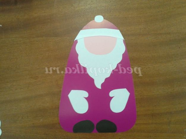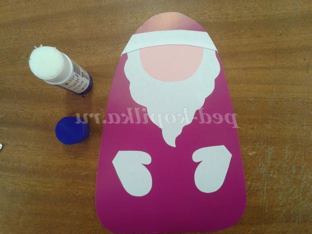 7.Вырезанные деталі розміщуємо на тулубі Діда Мороза і приклеюємо їх на клей олівець.