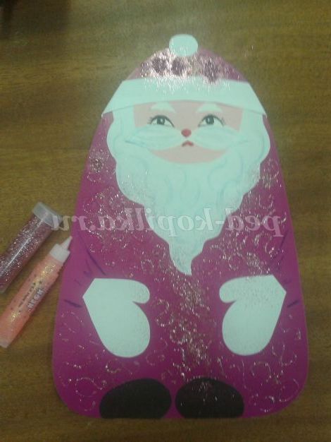 11. Дід Мороз - це казковий персонаж, тому шубку хочеться зробити блискучою, для цього будемо використовувати клей з блискітками. Можна намалювати різні візерунки на шубці Діда Мороза.