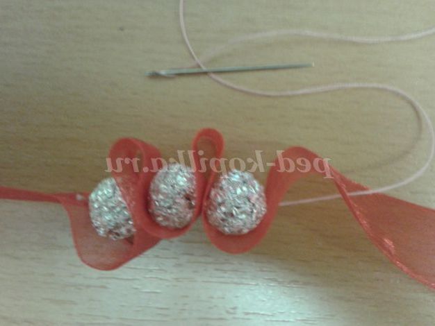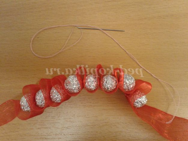4. Нанизуємо на голку намистини з фольги. Обов'язково залишаємо частину тасьми, для зав'язування.