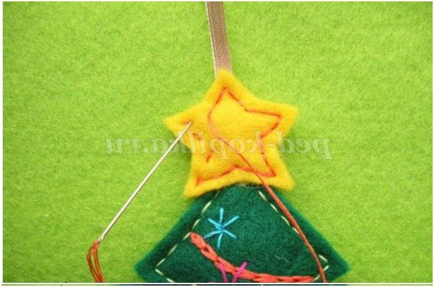 Залишається увінчати верхівку ялинки великий яскравою зіркою. Для цього одну яскраво-жовту деталь приклеїмо спереду, а другу - позаду ялинкової верхівки. Використовуючи нитку оранжевого кольору, стачаем деталі зірки подвійним швом «вперед голку». Для додання обсягу в середину зірки можна також вкласти невеликий шматочок синтепону.