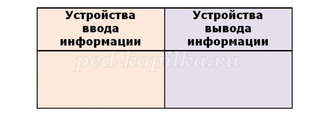 Заповніть таблицю, правильно розподіливши наступні пристрої введення/виведення інформації: монітор, клавіатура, миша, принтер, сканер, цифрові колонки, навушники, мікрофон.