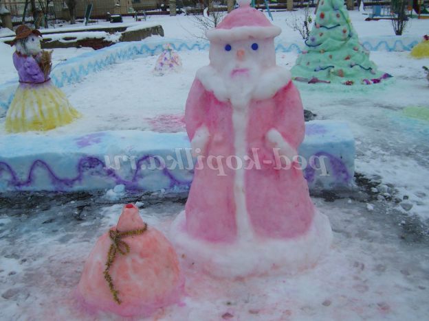 Конкурс був оголошений на 20 грудня і буквально 19 грудня була відлига,сніг весь став сирої і дуже добре став лепиться.В один день ми зліпили дуже багато виробів,розфарбували різними фарбами.