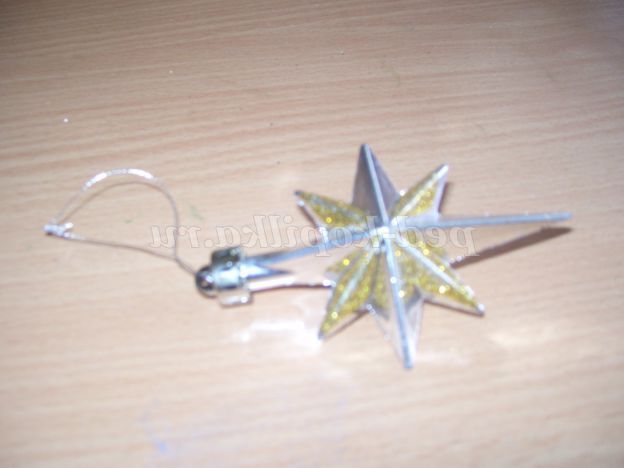 7. У ялинкової іграшки "Зірочка" зняла кріплення для підвіски і вставила в отвір сверху.Держится чудово без клею.