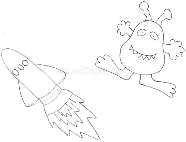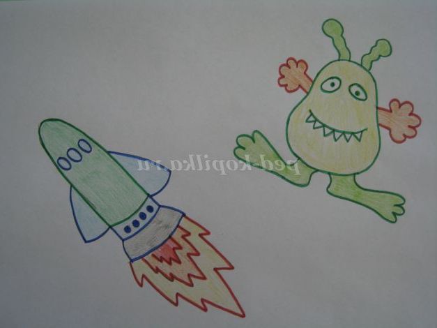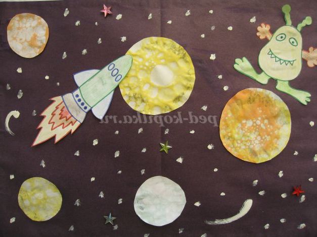 Наклейте планети на небо. Можна наклеїти розфарбованих і вирізаних інопланетян і космічні кораблі.