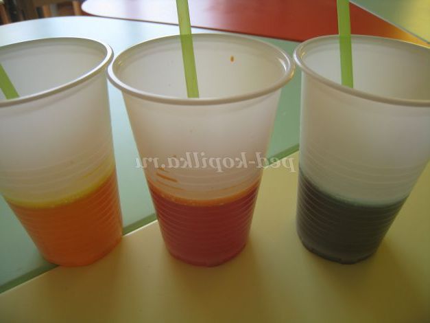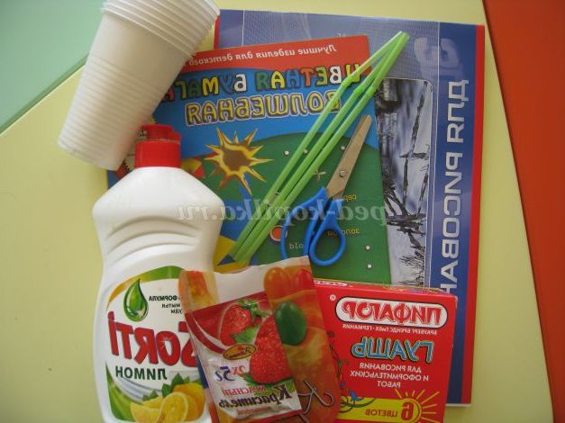 Розчиніть в пластикових стаканчиках барвники у відповідності з інструкцією на упаковці. Додайте рідину для миття посуду і добре розмішайте. Стакан повинен залишатися на 2/3 порожнім.
