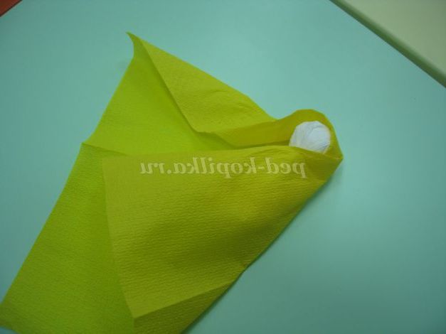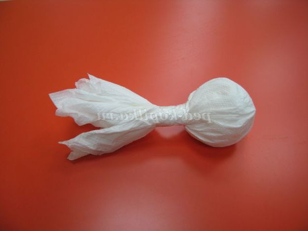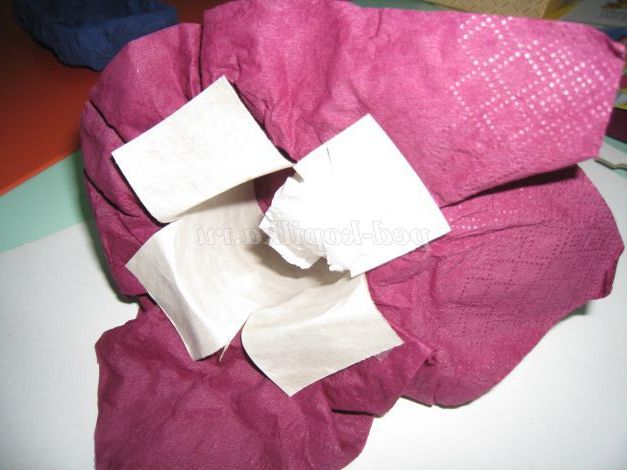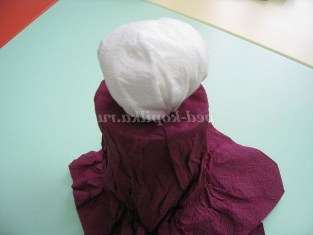Зімніть в кульку три звичайні білі серветки і загорніть його в дві розгорнуті серветки. З'єднайте і скрутіть куточки квадрата. Закріпіть скотчем.