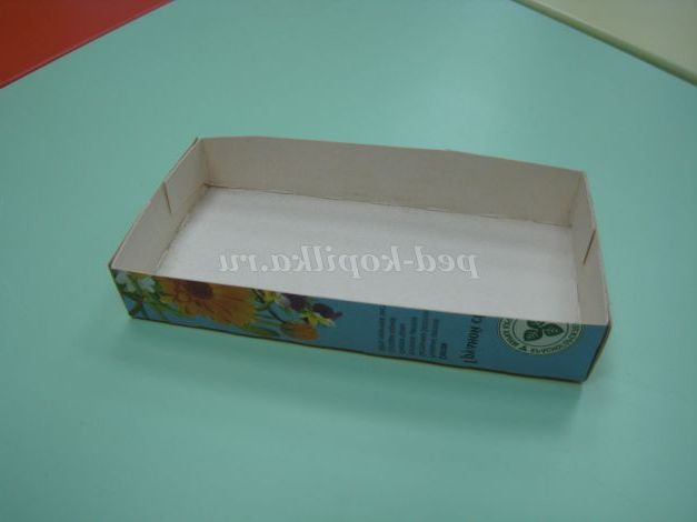 Обріжте коробку з-під чаю так, щоб вийшли бортики висотою 2 див. Застеліть серветкою і насипте олівцеву стружку.
