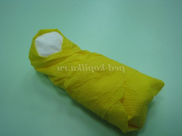 Зімніть одну серветку і загорніть її в іншу. Прикріпіть скотчем до маленького згортку з серветок. Розгорніть жовту серветку, вкладете в неї заготівлю і загорніть. Намалюйте обличчя і покладіть фігурку в ясла.