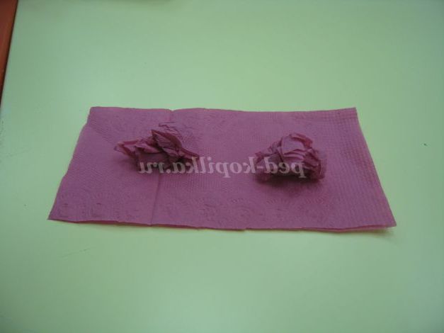 Виріжте з складеної навпіл серветки прямокутник 8х16 див. Зімніть два невеликі грудочки з серветок і покладіть їх на прямокутник. Поверніть рулон і перекрутіть його по краях і посередині.
