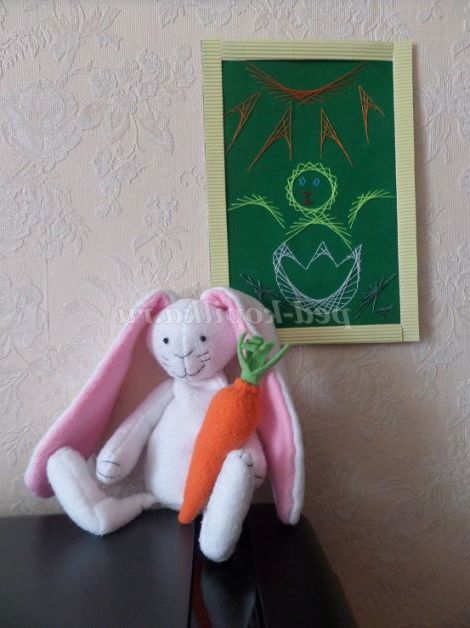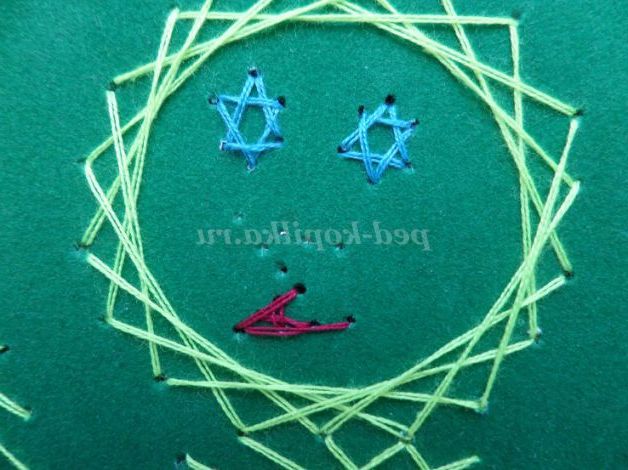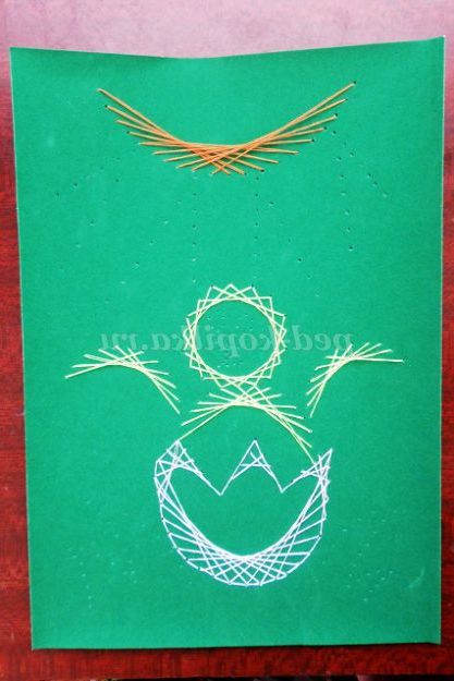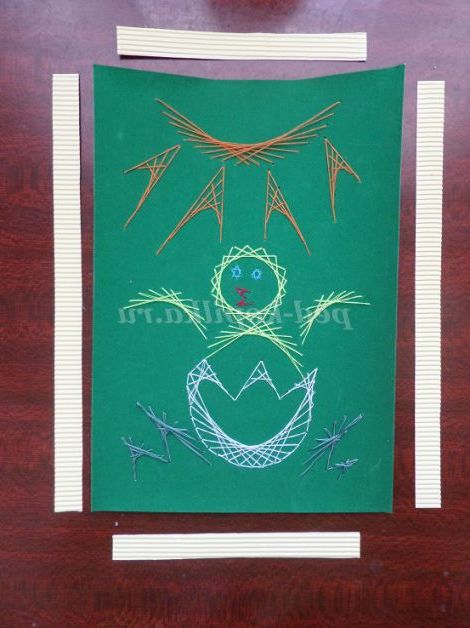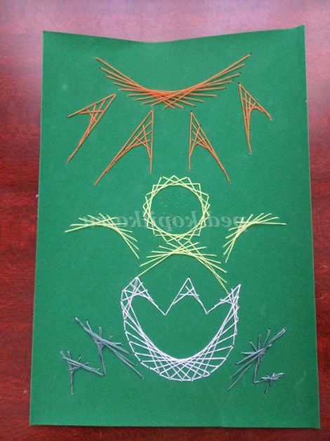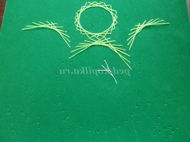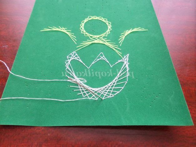 Матеріали: аркуш білого паперу для шаблону, лист гофрованого картону для рамки, лист зеленої оксамитової паперу такого ж розміру, що і аркуш білого паперу; нитки жовтого, білого, блакитного, червоного, помаранчевого, зеленого кольорів; олівець, лінійка, скотч, клей, ножиці, циркуль (знадобиться його вістря).