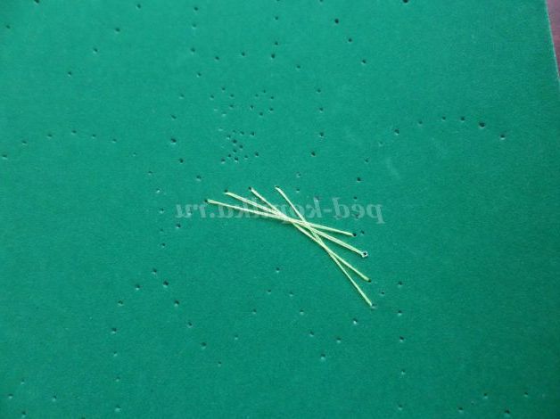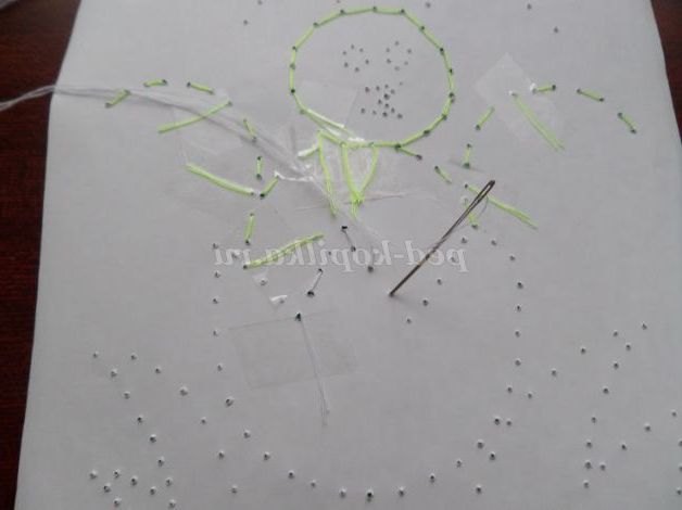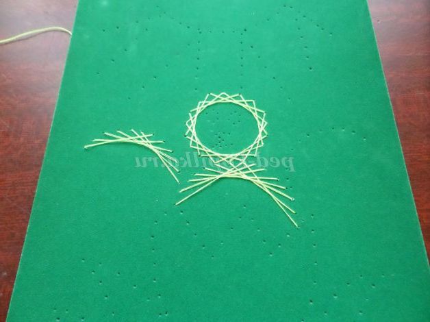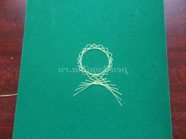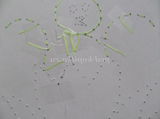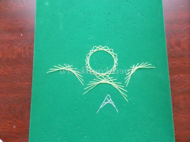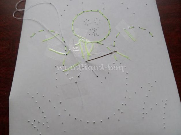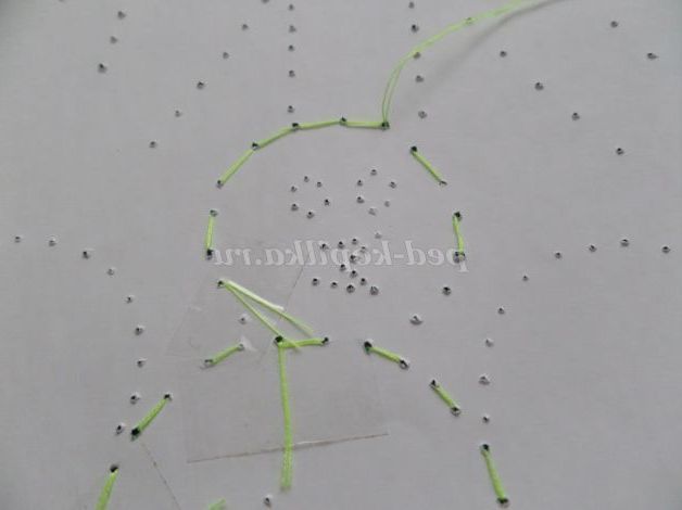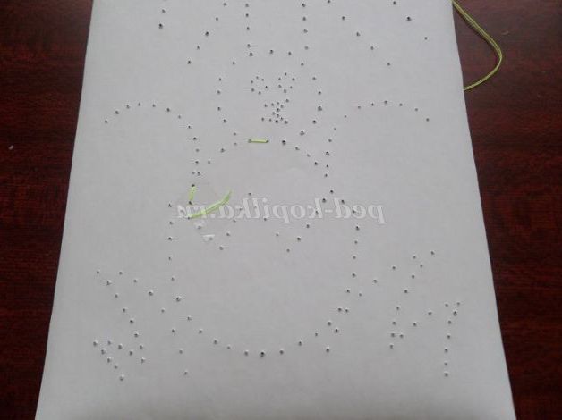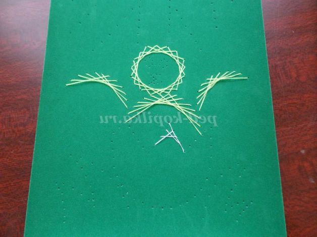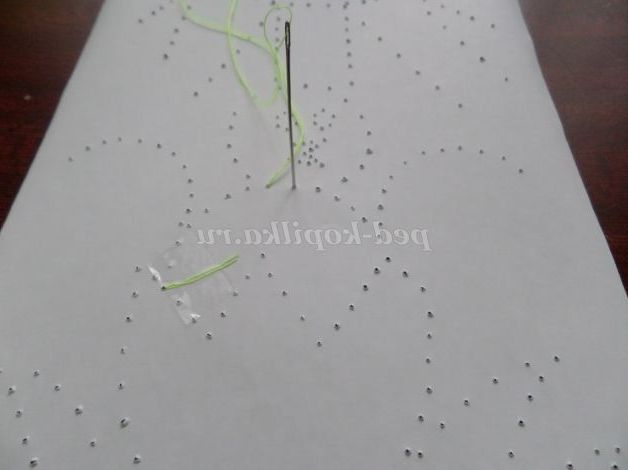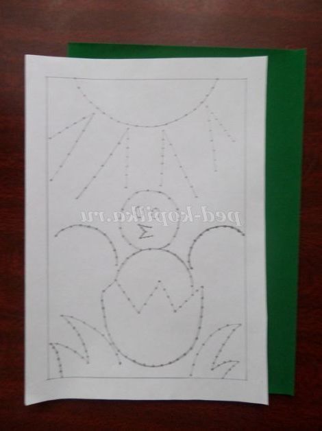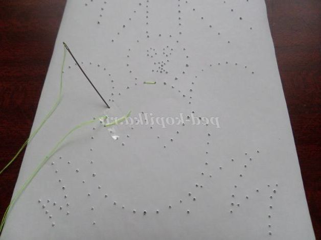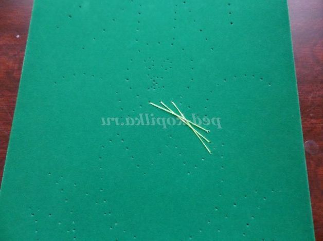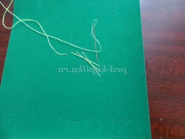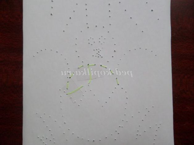 4.Накладываем шаблон на лист зеленого паперу і вістрям циркуля проколюємо отвори через обидва листи. Попередньо потрібно покласти роботу на щось м'яке (пінопласт, поролон) .