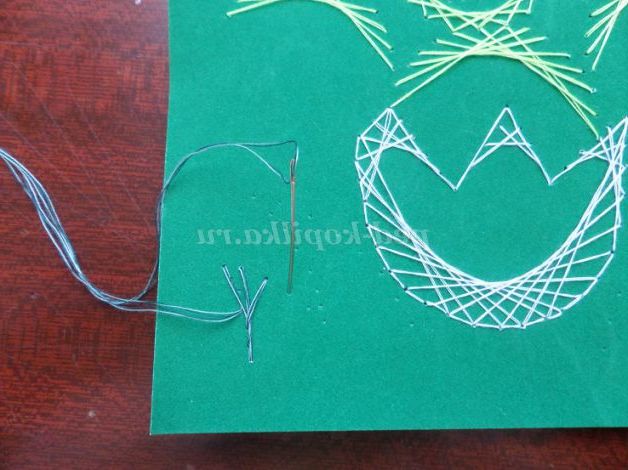 10.Теперь навчимося заповнювати кут - середина шкарлупки. Вводимо нитка з виворітного боку і закріплюємо скотчем. Послідовність заповнення кута дивіться нижче.