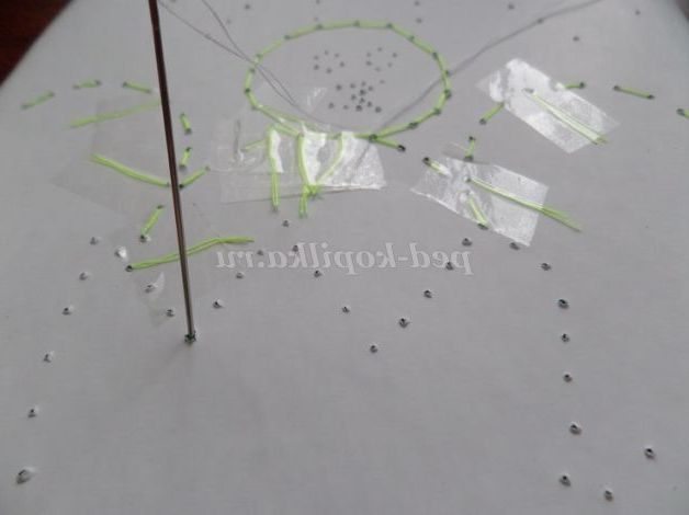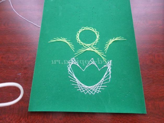 5. Почнемо роботу з вишивання тулуба курчатка. Воно має форму півкола. Нитка жовтого кольору втягає в голку і закріплюємо на звороті роботи скотчем.