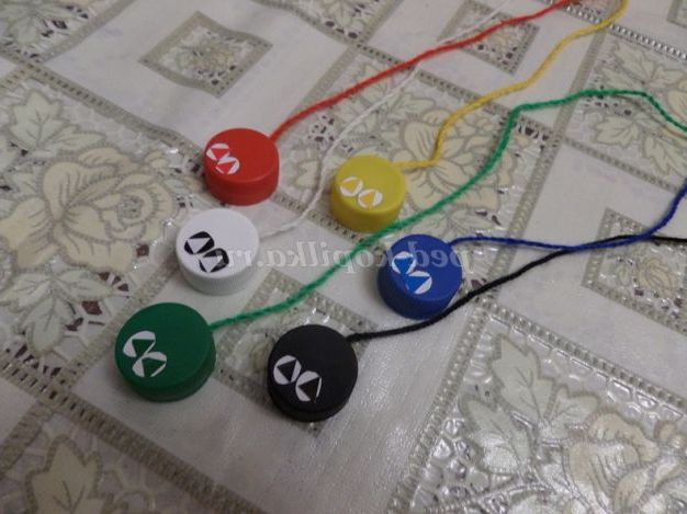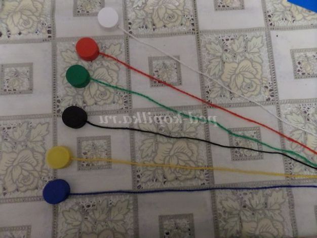 2. Прикріплюємо нитки до кришок з допомогою великих вузликів, протягнувши нитки крізь отвори кришок. Колір нитки відповідає кольору кришки.