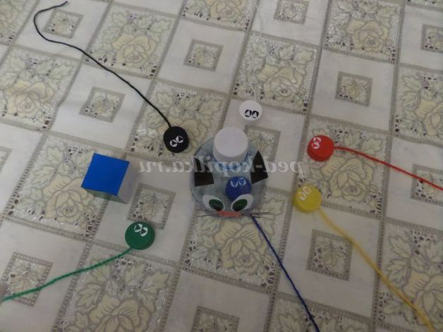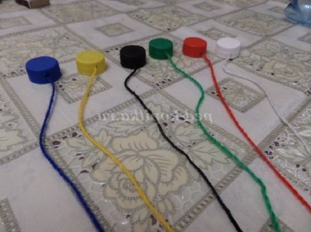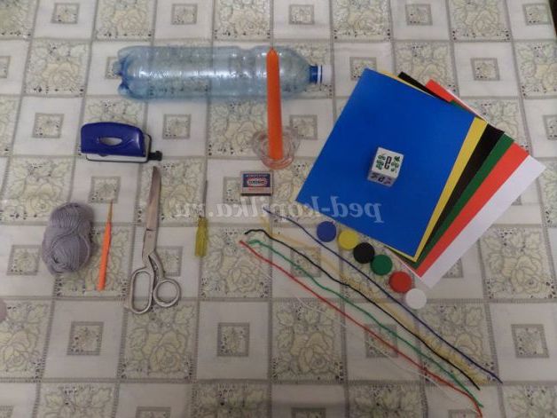 Матеріали: самоклеюча папір шести основних кольорів (червоний, синій, жовтий, зелений, чорний, білий), кришки від пластикових 1,5-літрових пляшок шести основних кольорів, 6 ниток довжиною 25-30 см основних кольорів, кубик, свічка, сірники, шило, ножиці, пластикова 1,5-літрова пляшка, дирокол, гачок і нитки для в'язання.
