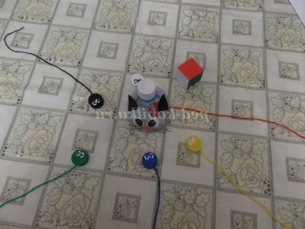 Правила гри: Вибирається 1 дитина - ведучий, 1 дитина - кішка, мишки - від 3 до 6 осіб. У ведучого в руках - кубик. Дитина - кішка тримає в руці «кішку». Діти - мишки тримають за нитки - «хвостики», а самі «мишки» лежать на столі. Ведучий кидає кубик. Мишка того кольору, який випав на верхній грані кубика, повинна «втекти», тобто дитина повинна потягнути за нитку, а кішка повинна зловити, т.е.накрыть мишку зверху. Хто швидше - мишка втече або спіймає кішка. Заскочені миші вибувають з гри. Переможцем вважається остання не спіймана миша.