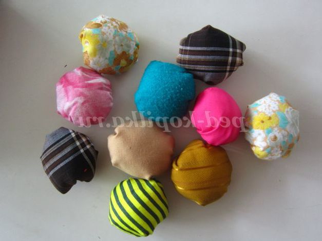 Так, м'ячики для нього я теж зробила м'якими - з тканини. Вирізавши коло діаметром 20 см. я зібрала його по краю на нитку і стягнула в центрі, попередньо набивши ватою. Вийшов чудовий маленький м'ячик.