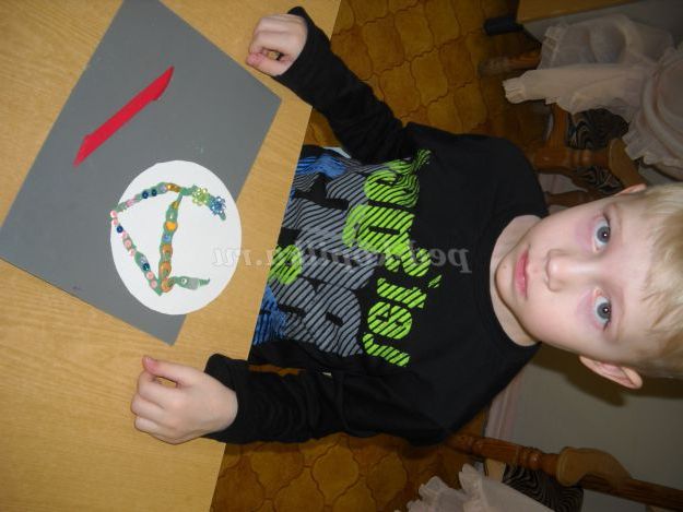 Вихователь: А тепер, хлопці, я пропоную вам, з допомогою різнокольорових джгутиків спробувати створити свої незвичайні букви. Ми будемо прикріплювати їх на круглі диски, які лежать у вас на столах.